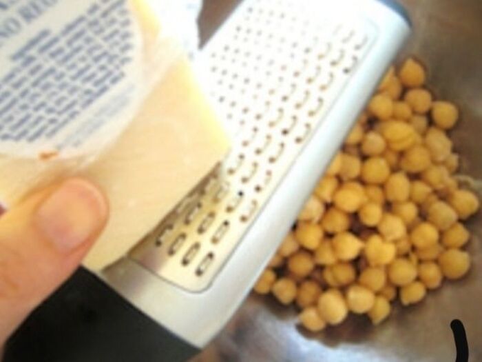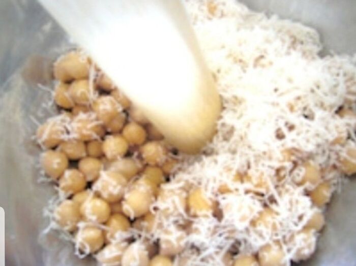 缶詰からヒヨコマメをザルにとり水気を取りボウル(またはすりこぎ)に入れる。