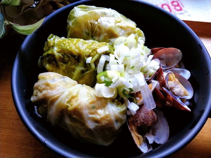 タネに練り込んだ味噌とあさりとだしの旨味をロールキャベツがたっぷり