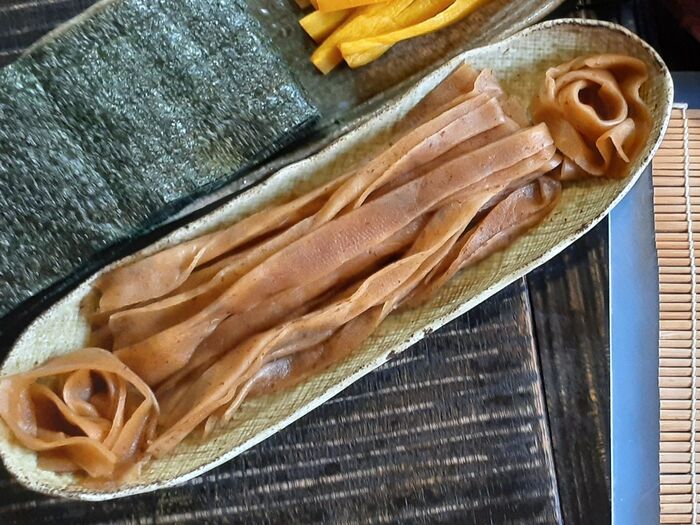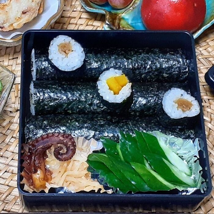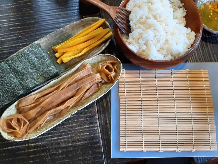 ③巻き簾に、海苔をのせる→酢飯を広げる→汁気を絞ったかんぴょう又は沢庵をのせて巻く。