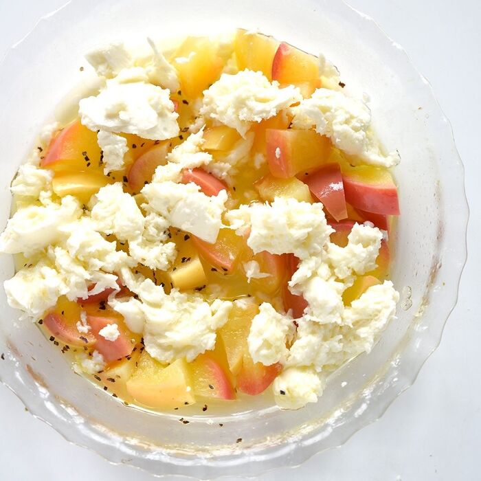 3:2に1と生モッツアレラを食べやすい大きさに手でちぎり入れ、混ぜ合わせる。