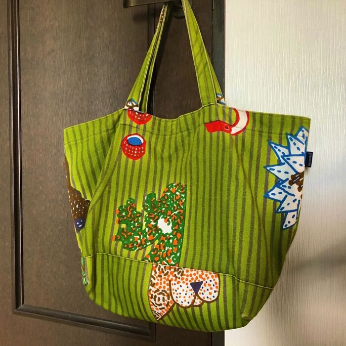 この黄緑色に、北欧らしい明るい色使いのほっこり動物達のデザインが大好きで、鞄も以前から愛用しています♡