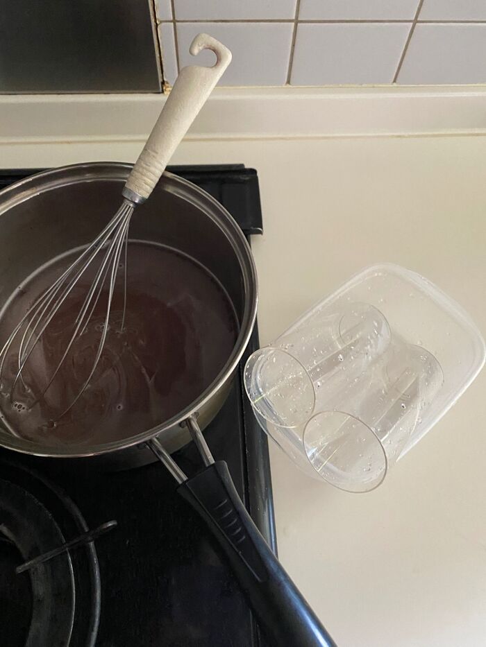 ⑦⑤が固まったら、⑥を入れ容器を立てて、冷蔵庫で冷やし固めます。