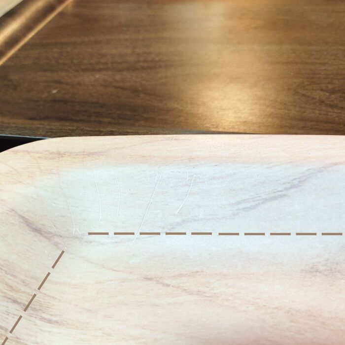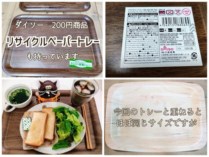 ただ、ひとつ残念なことが…!昨年から使っている、ダイソーのリサイクルペーパートレーと比べると、食器が置ける範囲が狭い…。