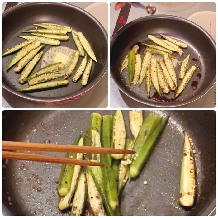 焼けてきたらバターを加え香りづけの醤油をたらし絡める。