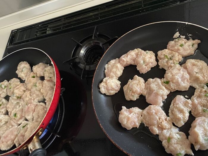 つくねが焼き上がりましたら、炒めた本しめじ、きゅうりを入れ