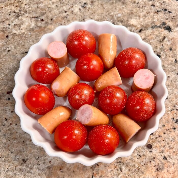 耐熱皿にヘタを取ったトマトを並べ、ごく軽く塩胡椒したら