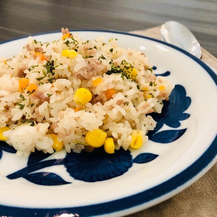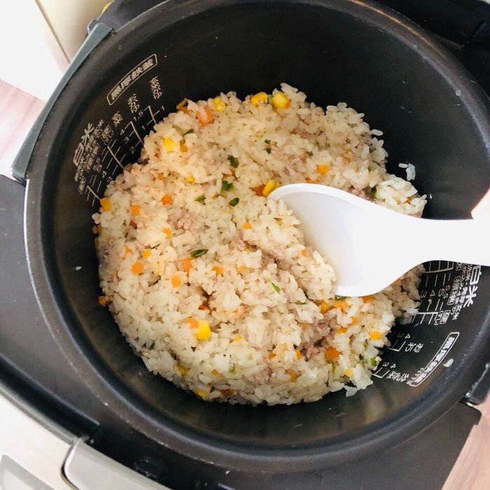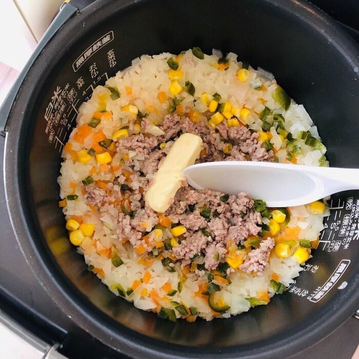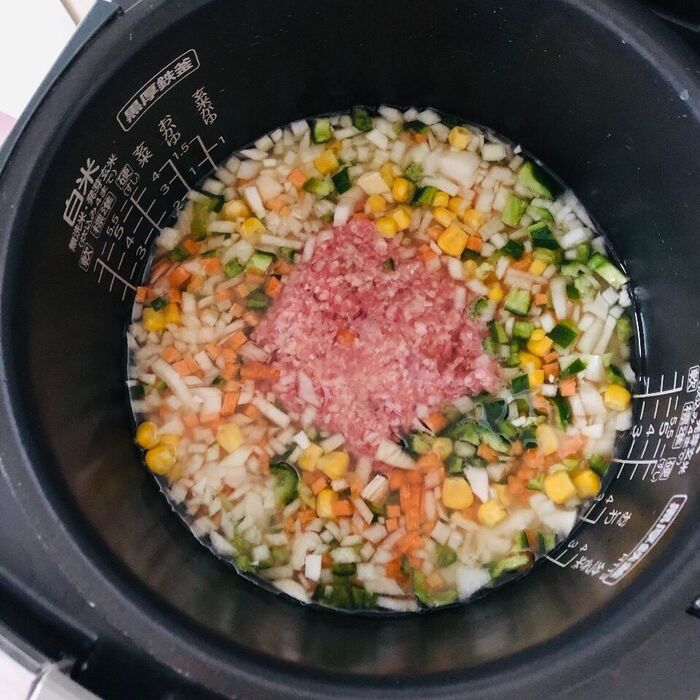 炊飯器に米と★を入れ、2合の目盛よりやや少ない水を加えて軽く混ぜ合わせ、玉ねぎ、人参、ピーマン、冷凍コーン、豚ひき肉を入れ、塩(分量外)を軽く振り、炊飯ボタンを押す。