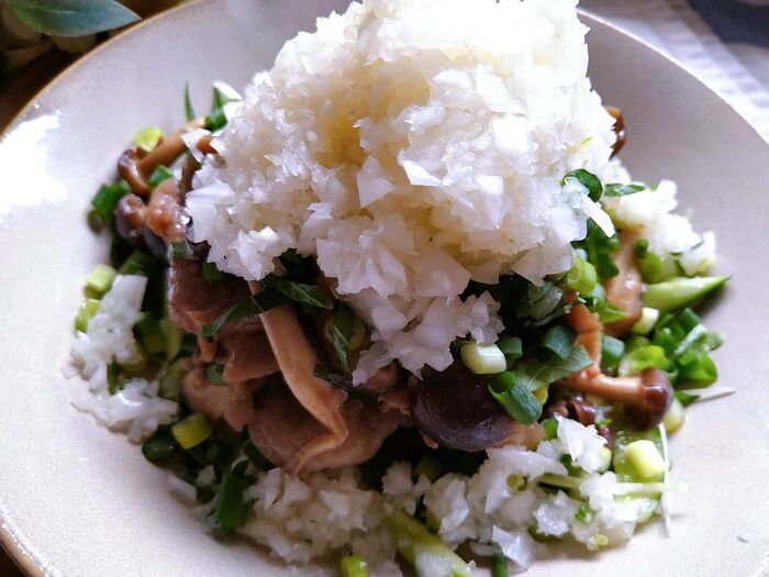 揉み込んで玉ねぎがしんなりしたらこめ油と砂糖を加えてドレッシングを作ってみてください。
