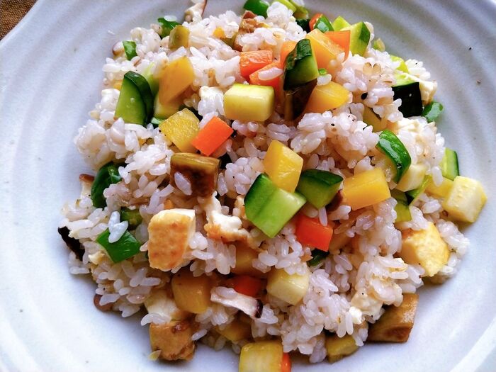 水切りのいらない厚揚げを使って。野菜もたっぷりのチャーハンです。