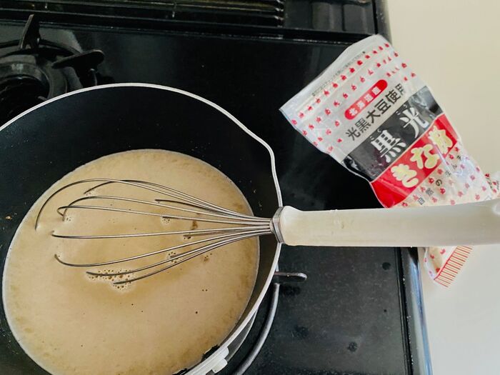 ①小鍋に水、粉末寒天、三温糖、きな粉を入れかき混ぜながら火にかけます。