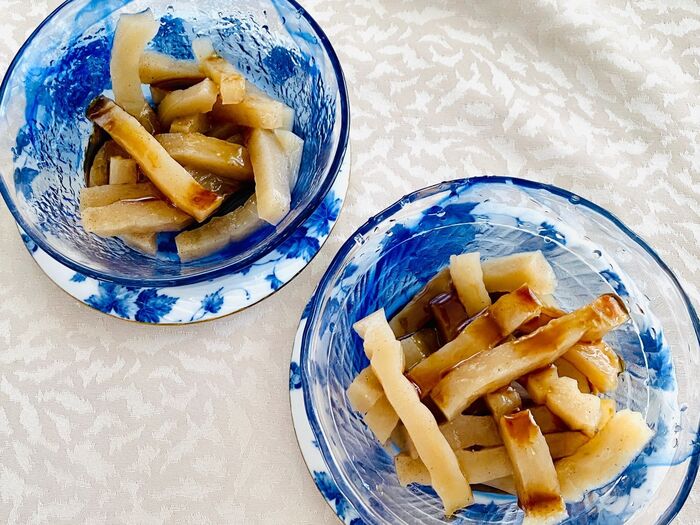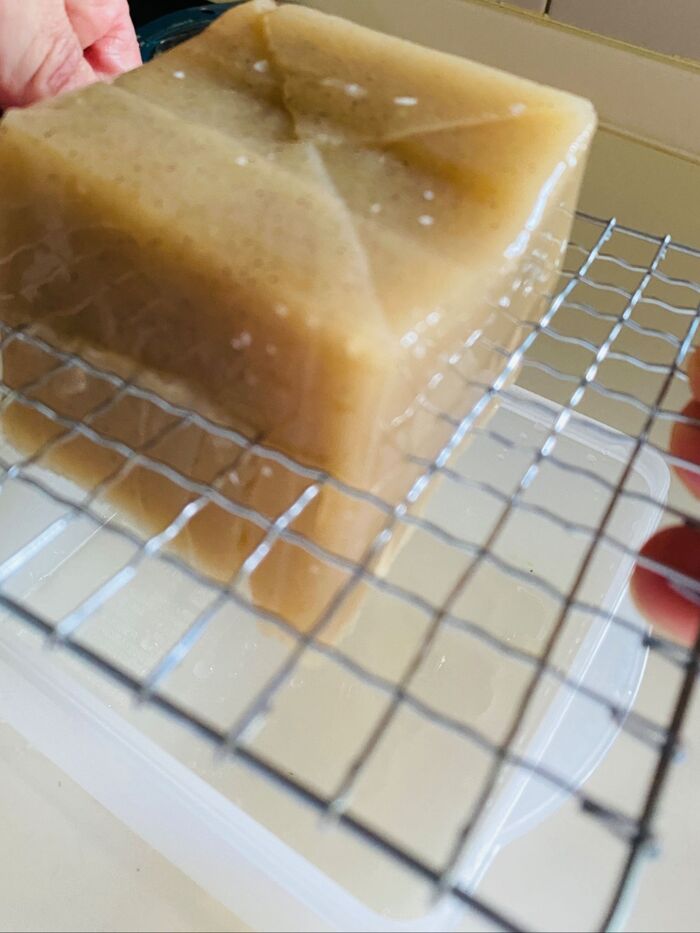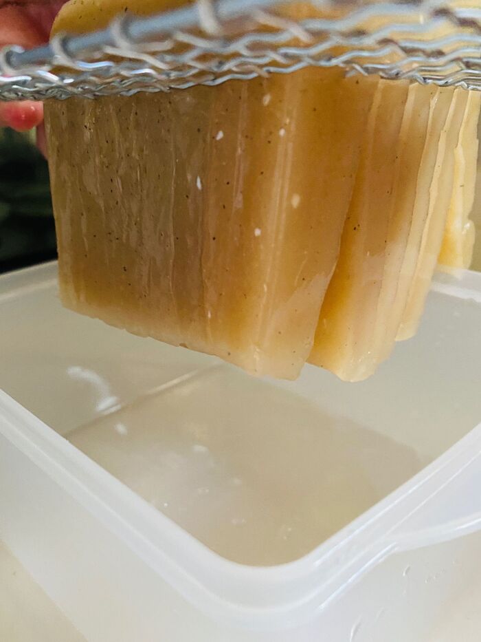 焼きあみの穴を通して、きな粉寒天が出てきました。