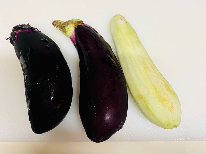 茄子は皮を剥きます。