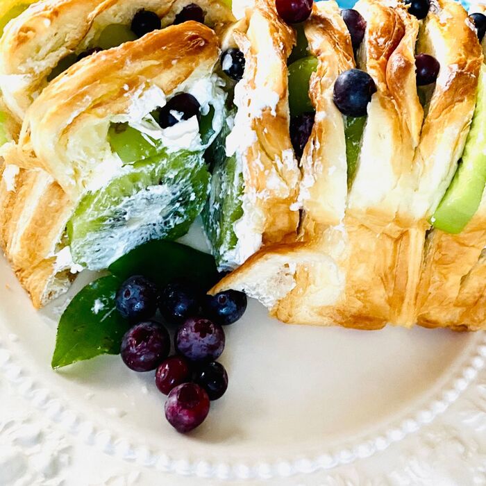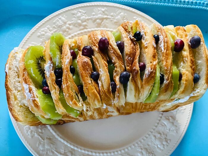 輪切りにしたキウイフルーツ、縦半分に切ってたシャインマスカット、ブルーベリーを挟んでいきます。