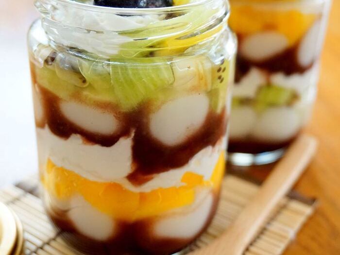 白玉、小倉(あずき缶)、生クリーム、黄桃、キウイ、ブルーベリー。フルーツはなんでもいいですが酸味のあるものが入ると小倉クリームの甘さと合います。