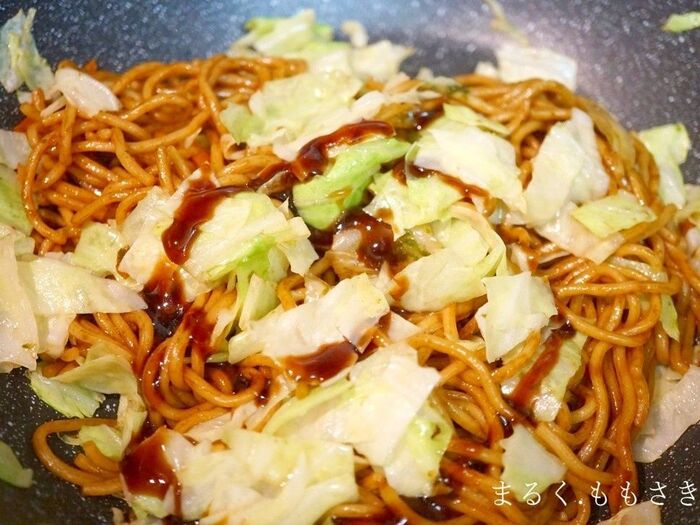 ④全体を炒めたら、お好み焼きソースを少し足す。