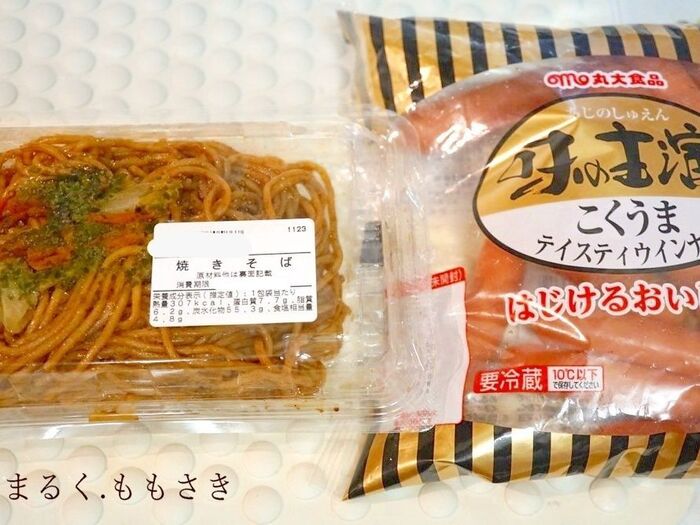 この焼きそば250g入りで100円。右は家にあったウィンナー。