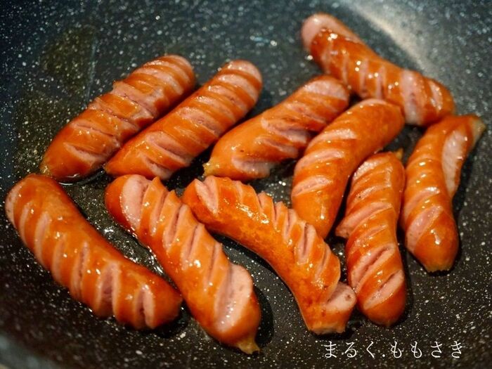 ①ウィンナーに切込みを入れオリーブオイルで焼く。