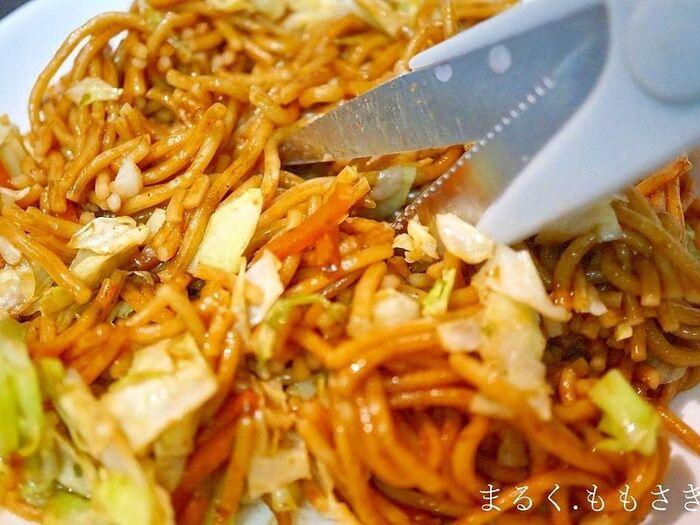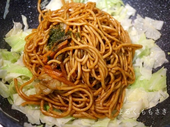 ③レンジで40秒ほど温めた焼きそばを入れ~