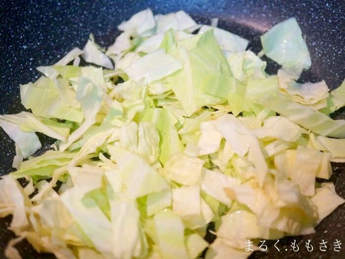 ②キャベツを大きめに切り、ウィンナーを焼いた後のフライパンで残っている油で炒める。