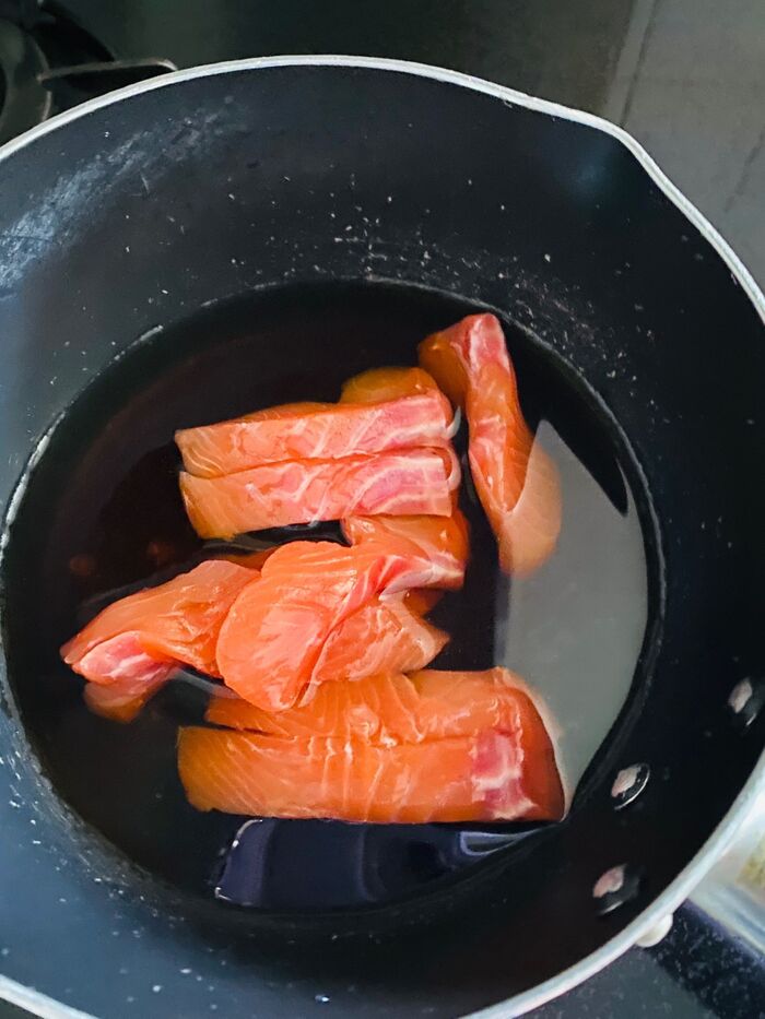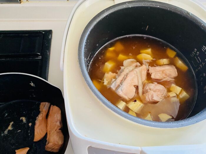 鮭を加えて煮ます。火が通りましたら火を止めます。