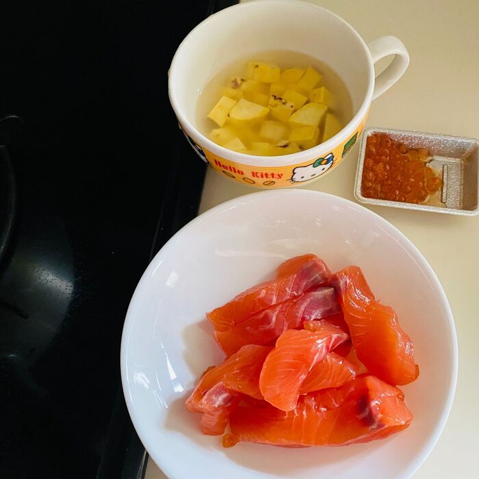 ザルで水気を切り、鮭の煮汁に水100ccを加えて