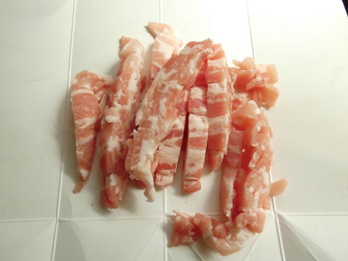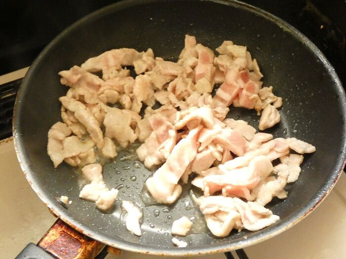 フライパンに薄く油をひき、豚バラ肉を炒めます。
