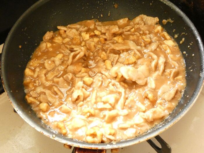 色が変わってきたら、くるみと★印の材料を入れて炒めます。水分が少し減ったら完成♪