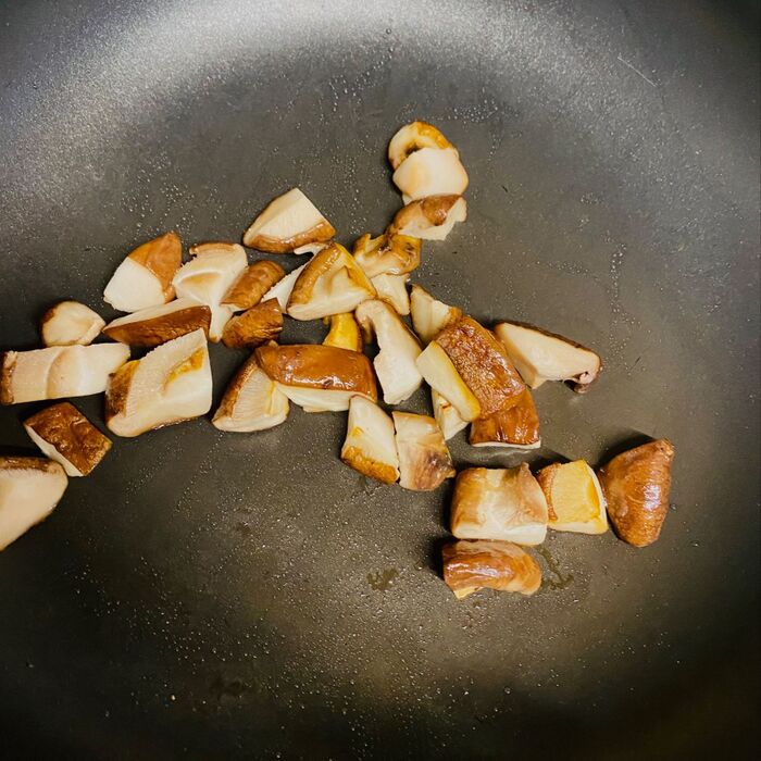 フライパンを熱し、油とガーリックを入れ椎茸を炒めます。