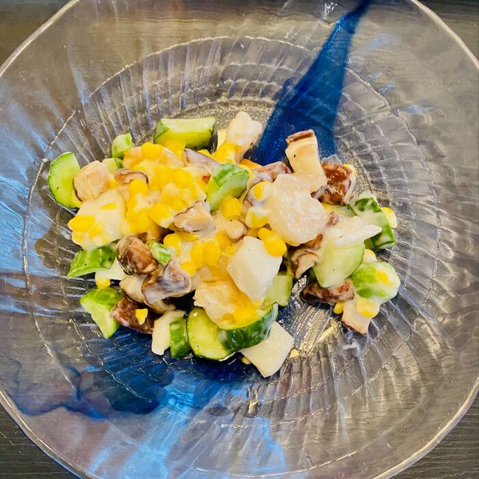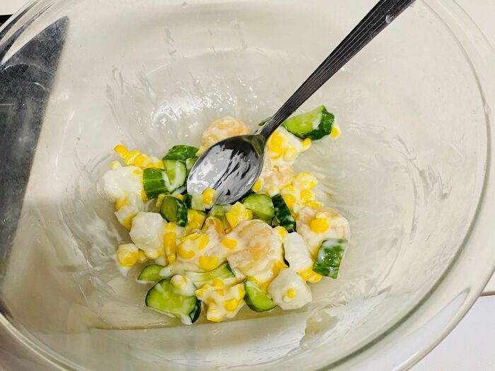 ①ボウルに茹でたエビ、大まかに潰した茹で卵、小口切りにした胡瓜、水気を切ったコーンを入れ混ぜます。