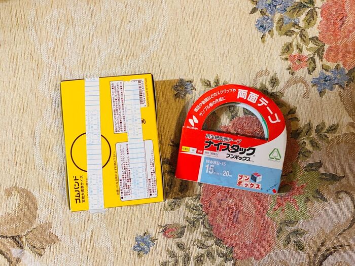 ①輪ゴムの箱の後ろ側に両面テープを貼ります。