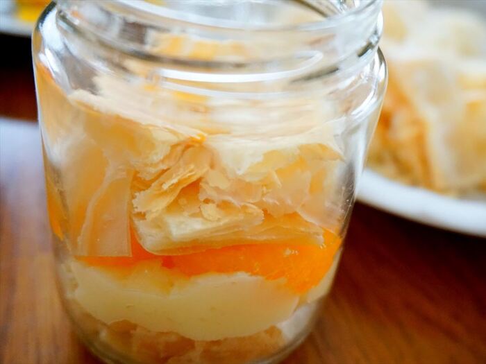 パイは3層くらい入れて間にカスタードクリームとフルーツが入る要領で好きな順番で重ねて詰めていきます。