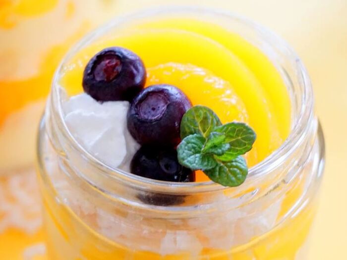 黄桃、ミカン、ブルーベリー、生クリームで飾り、仕上げにミントの葉を添えて完成。