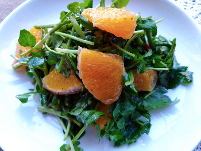 4.ボウルにクレソン、三つ葉、オレンジを入れてざっと混ぜ皿に盛りつける