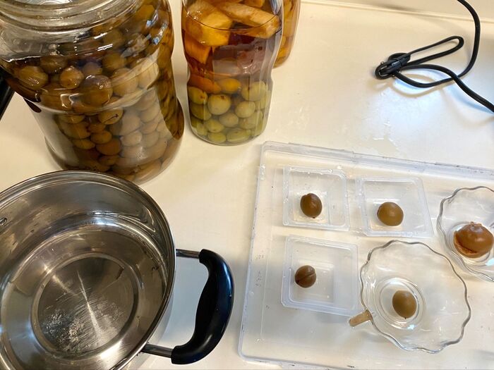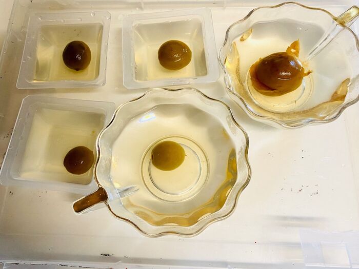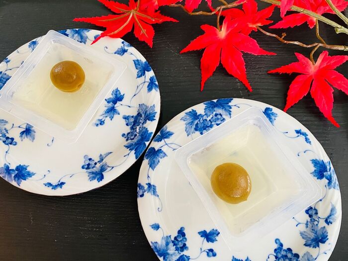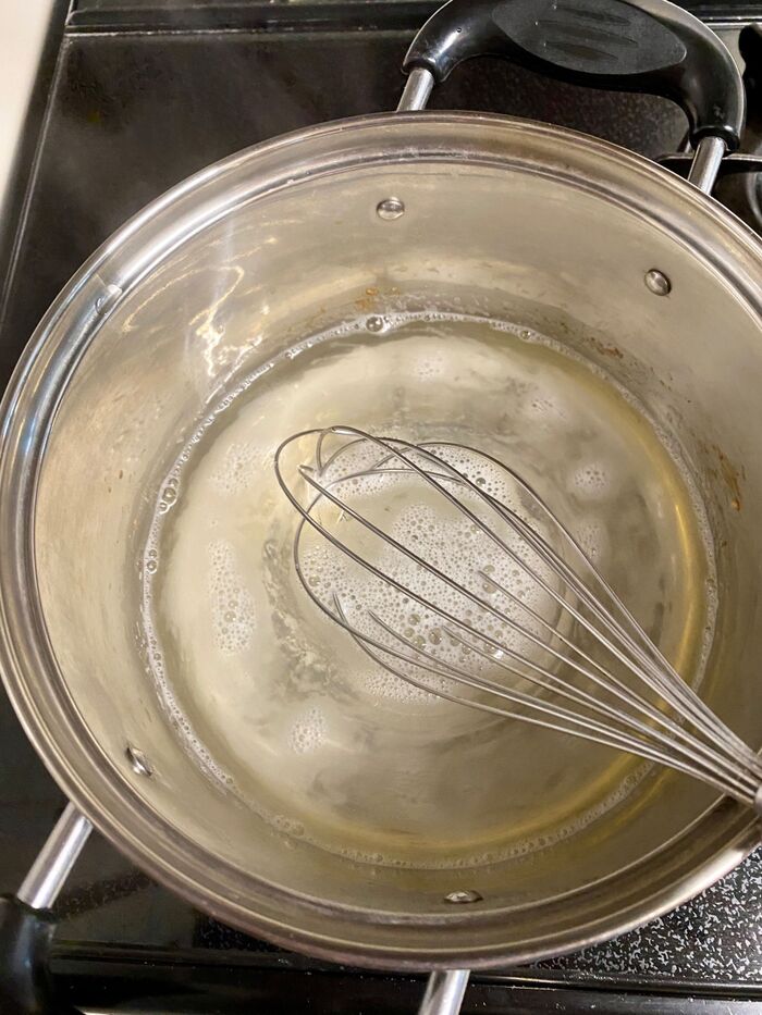 ②小鍋に梅酒50cc、水250cc、砂糖、ゼラチンを入れ火にかけ、かき混ぜながら煮溶かします。