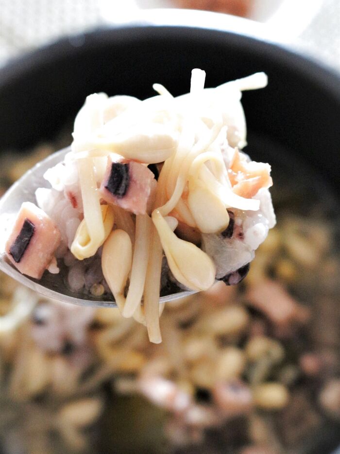③②に豆もやしとご飯を加え、蓋をして3分程煮る。