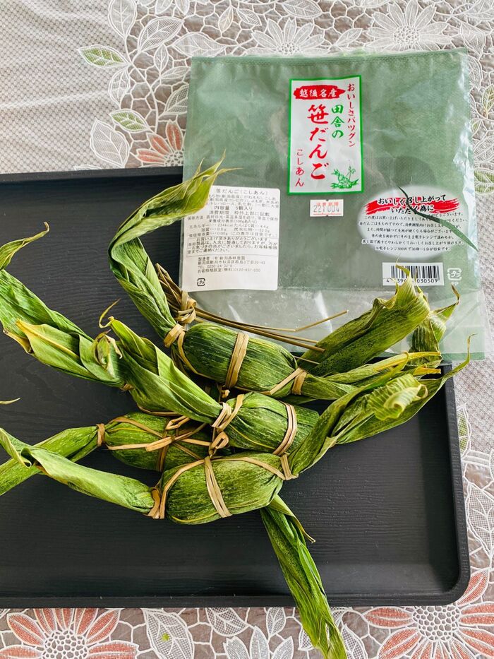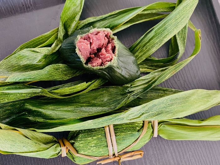 笹の皮をクルクル外すと、緑色のよもぎ餅の中にこし餡がたっぷり入っています。
