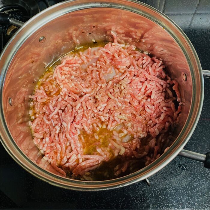 ①鍋に、豚ひき肉を入れ、かぶるくらいの水、生姜、砂糖、醤油を入れて煮ます。