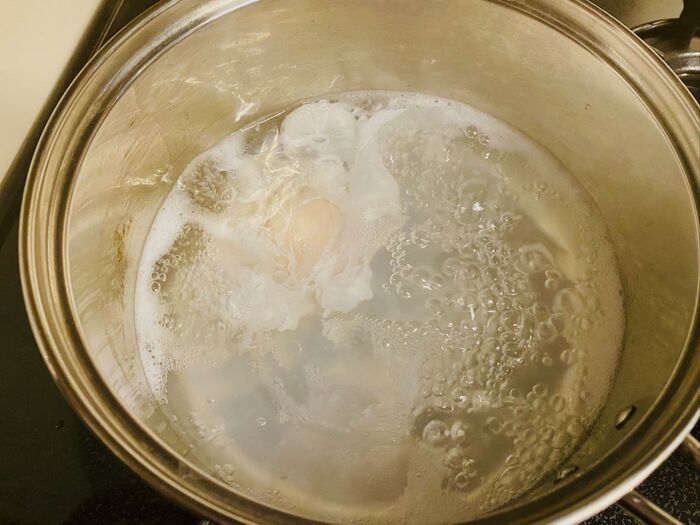 鍋に水をたっぷり入れて、沸きましたら、酢、塩をひとつまみ入れ