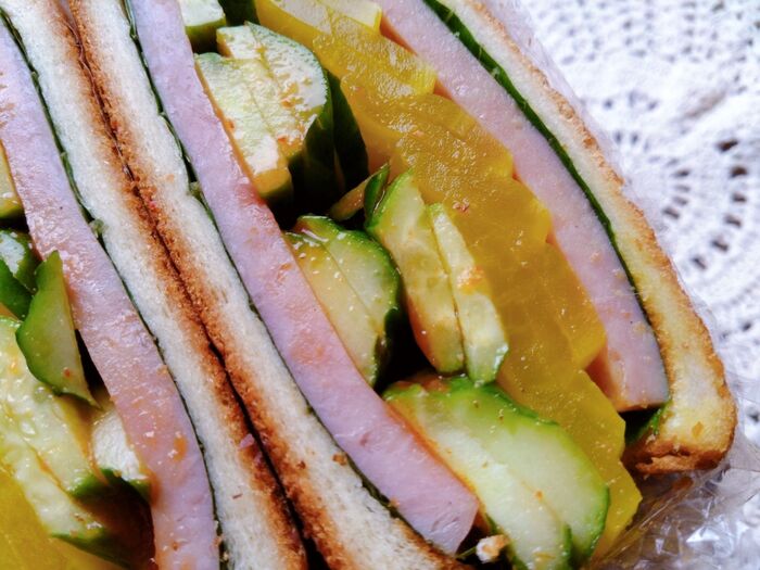 たくあんときゅうりを重ね、ハムをのせる