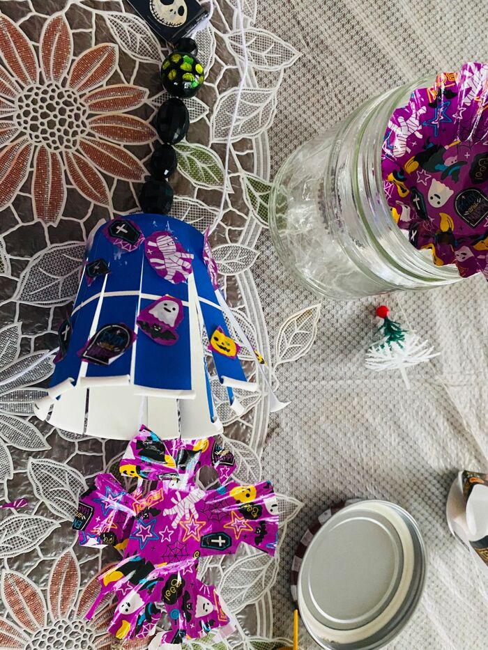 ②おかずカップを使って、可愛いキャラを切り抜き、両面テープを貼ってシールを作ります。①に貼ります。