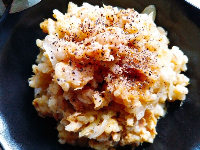 2.玉ねぎがしんなりしてきたらご飯と酒を加えてほぐしながら炒める
