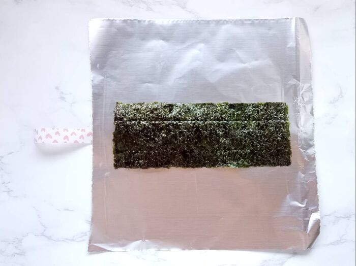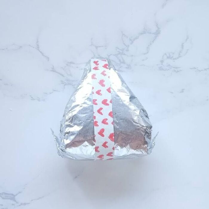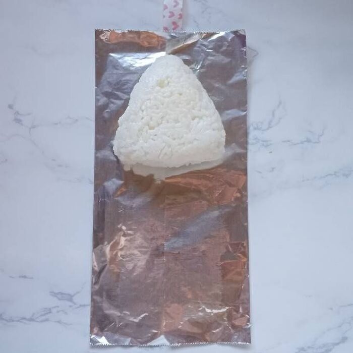 【7】アルミホイル(マスキングテープが出ている方)に、おにぎりをのせます。