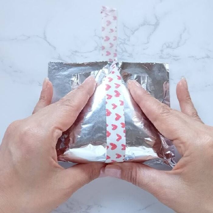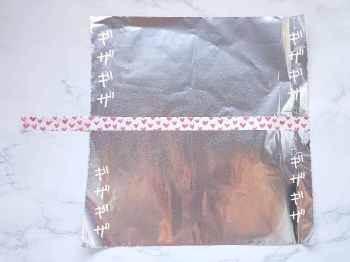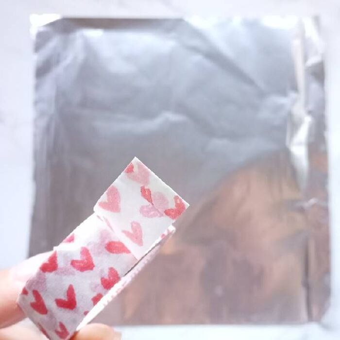 【9】下のアルミホイルを折りたたんだら、マスキングテープでとめます。