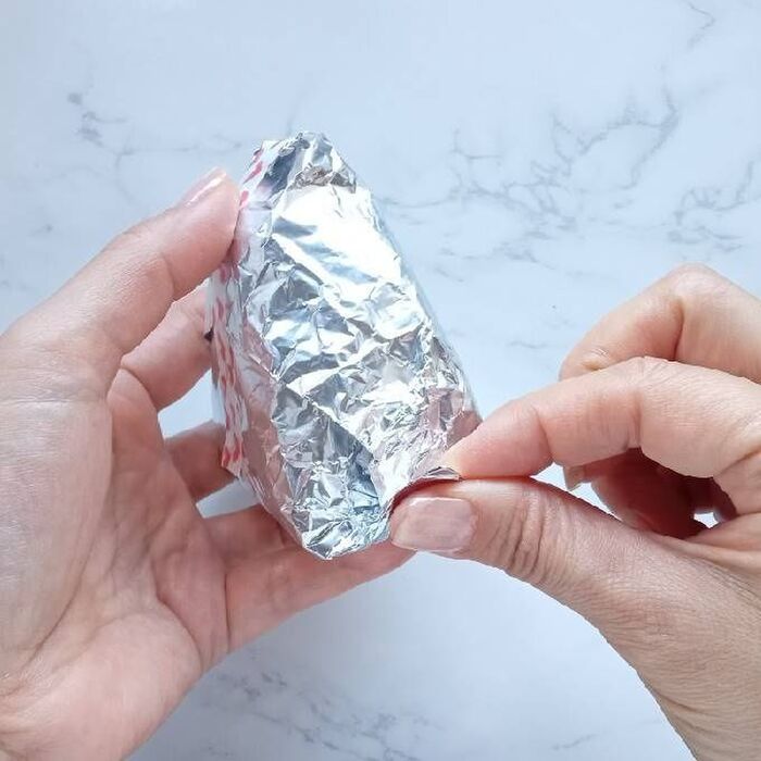 【8】アルミホイル手前をかぶせて、上からおさえます。