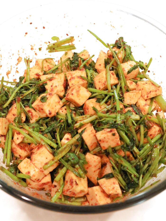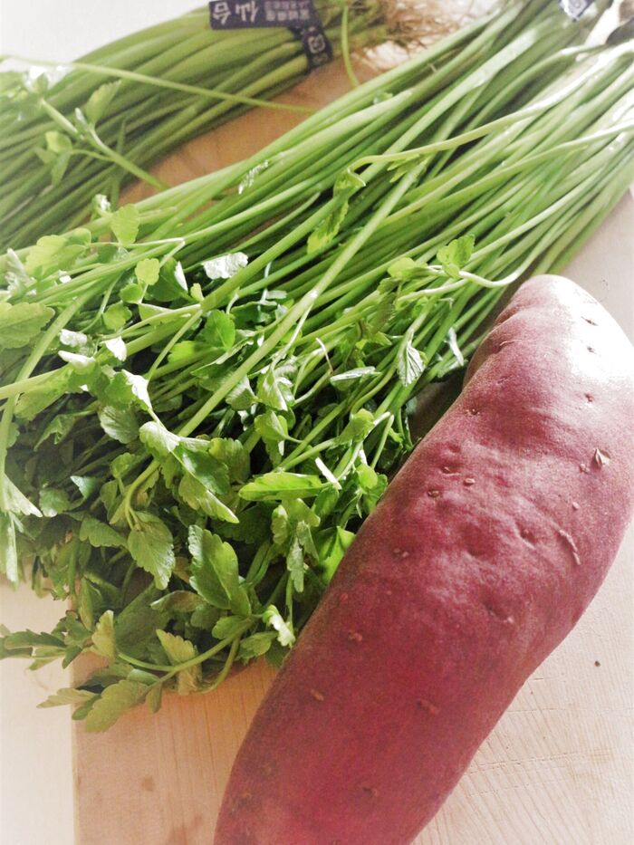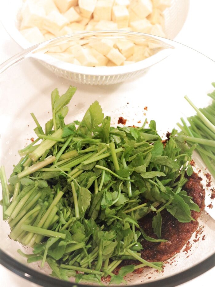 ② セリは流水でキレイに洗ってから、長さ3cmに切って@と混ぜておく。