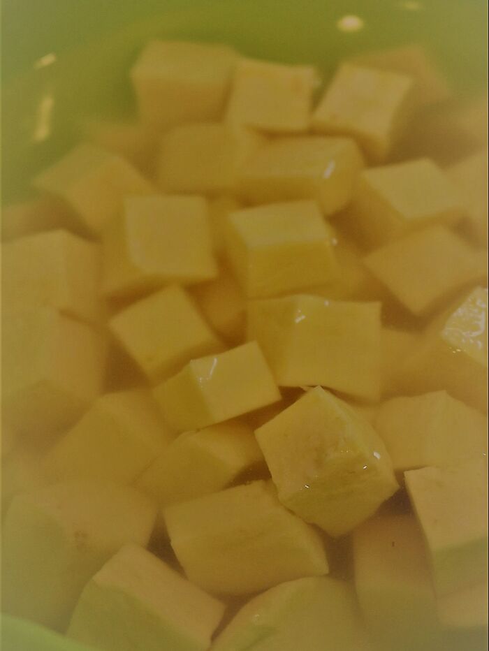 ①さつま芋の皮を剥き、1cm角に切って水2cupと塩小さじ1に20分ほど浸ける(さつまいものでん粉を取り、さっぱりとした味にするためです)。