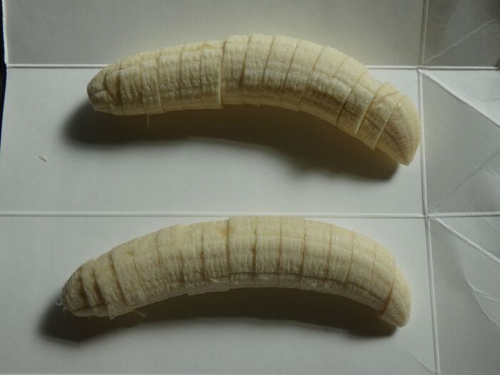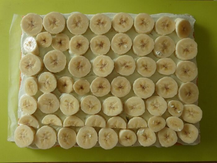 スポンジケーキ1枚にクリームを塗り、バナナを乗せます。スポンジケーキを重ねたら、生クリームを全体に塗ります。