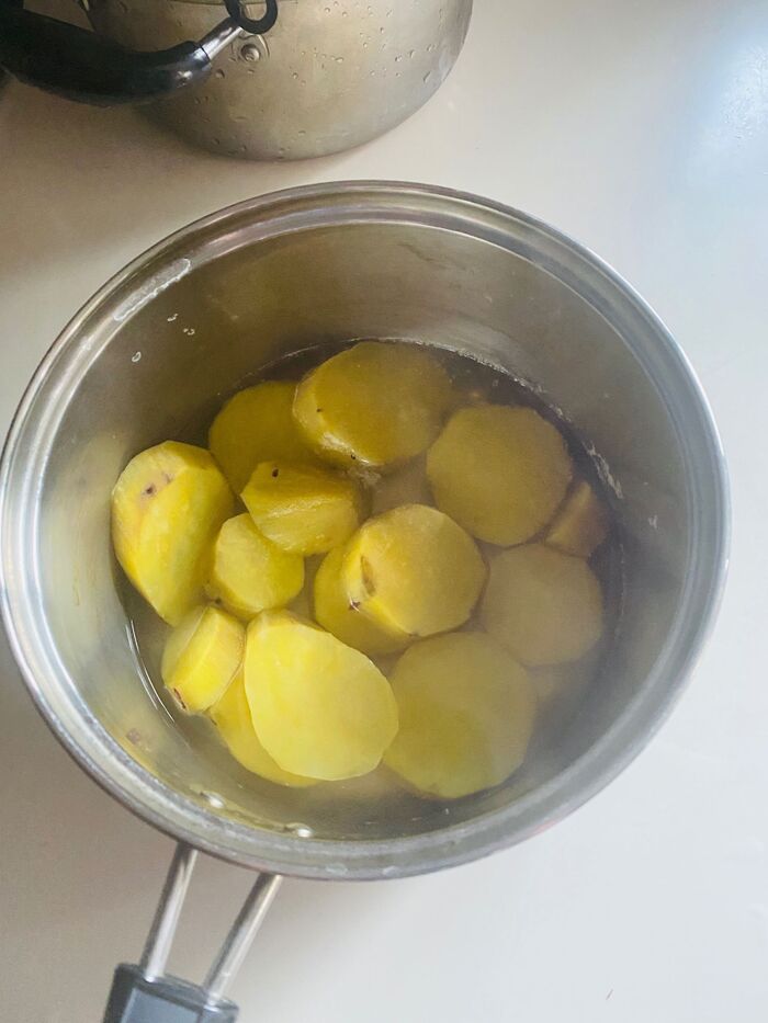 さつまいもは皮を剥き、水に浸し灰汁を取ります。