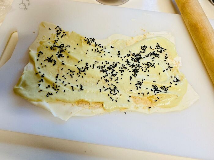 そこに、お芋パイを、クネクネ巻きにして乗せます。