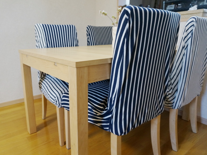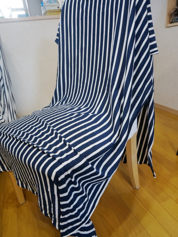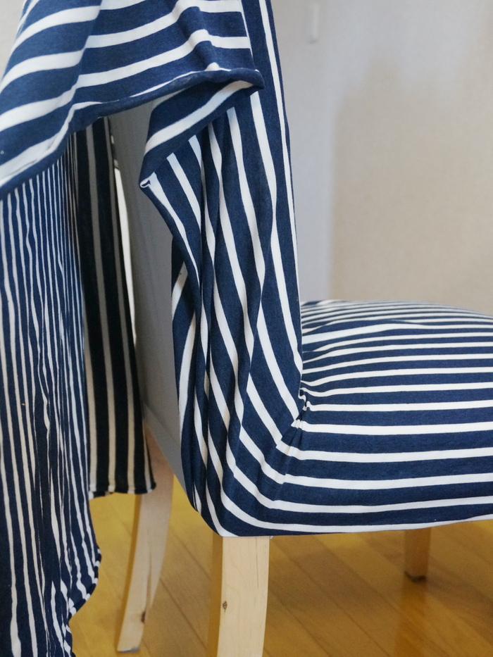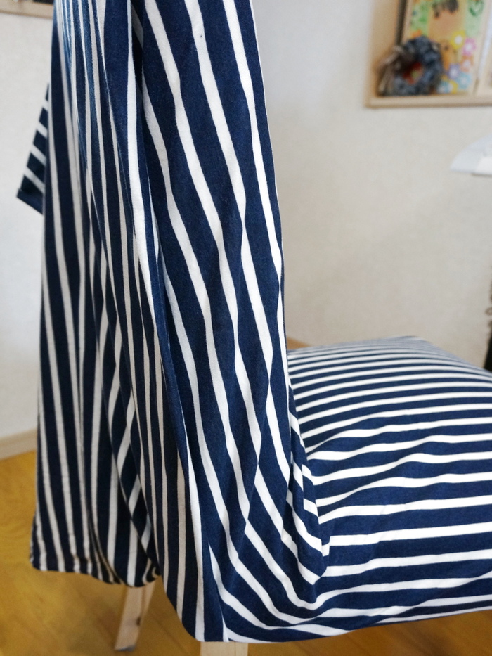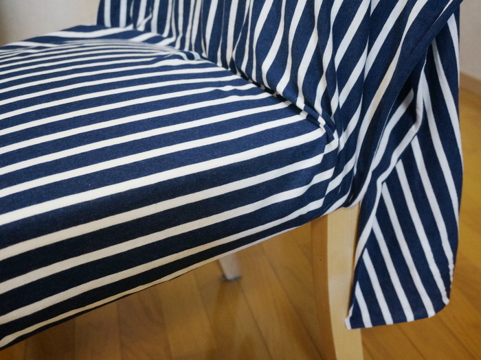 伸びるカバーを持っていなくても、ゴムを使えば、このやり方で椅子カバーが替えられるところがポイントです。